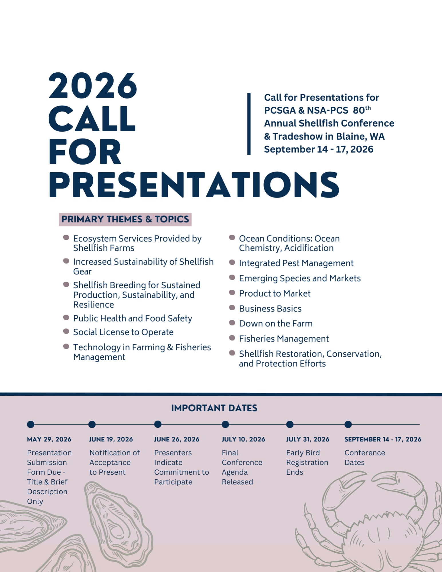 We are seeking presentation titles and workshop ideas that reflect the depth, diversity, and innovation of the shellfish industry. The PCSGA–NSA Pacific Coast Conference welcomes voices from all sectors—farmers, scientists, economists, lawyers, chefs, educators, and advocates—offering practical insights, research findings, case studies, and bold ideas for the future.